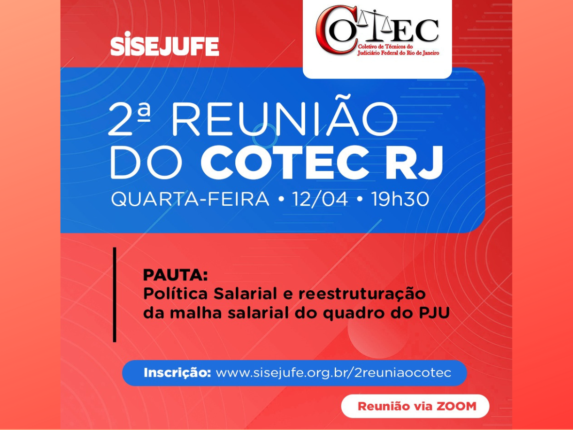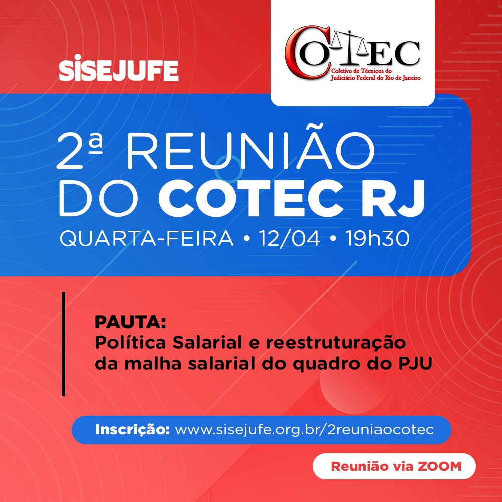 O Coletivo de Técnicos Judiciários do Sisejufe(Cotec RJ), se reunirá na quarta-feira, dia 12 de abril, às 19:30h, pela plataforma do ZOOM, para discutir a política salarial e reestruturação da malha salarial do PJU.