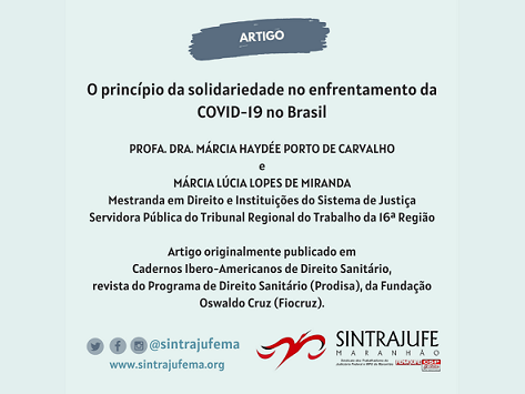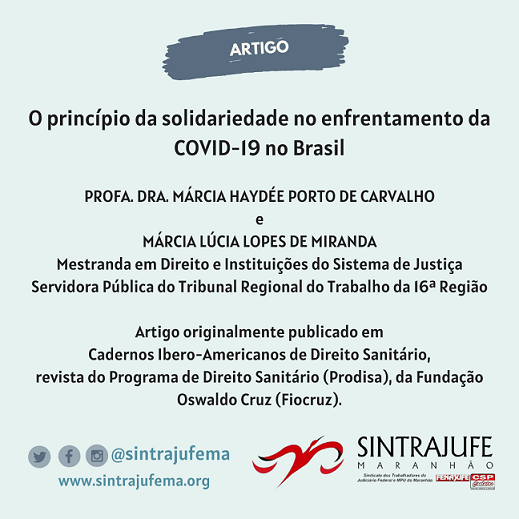 Por ocasião do Dia Nacional de Luta em defesa do serviço público e pela vacinação em massa, republicamos, neste 24 de março, o artigo O princípio da solidariedade no enfrentamento da COVID-19 no Brasil, de autoria da professora doutora Márcia Haydée Porto de Carvalho, da Universidade Federal do Maranhão, e de Márcia Lúcia Lopes de Miranda, nossa colega filiada ao Sintrajufe/MA e mestranda em Direito e Instituições do Sistema de Justiça, também pela UFMA.