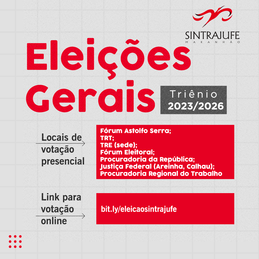 O Sindicato dos Trabalhadores e Trabalhadoras do Judiciário Federal e do MPU do Maranhão (Sintrafufe-MA), convoca todos os filiados para eleição que elegerá os representantes da categoria..