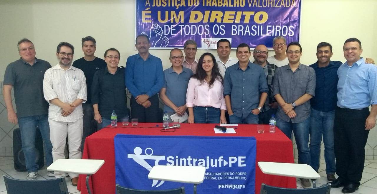 Pela direção do Sintrajuf-PE estavam presentes no Encontro o presidente, Manoel Gérson – que mediou a mesa -, Max Wallace (vice-presidente), Elielson Floro (secretário geral) e os diretores Marcela Soriano, Luís Fernando Costa, Carlos Felipe dos Santos, Juvando Oliveira, Eloy Teotônio, Paulo Abreu e Leonardo Vila Nova.