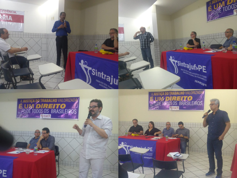 Entidades sindicais e centrais estavam no evento representadas por Helmilton Bezerra (CTB/Sinpro), Euler Pimentel (CSP-Conlutas e TRT), José Bonifácio (Sindsprev/CUT), Wagner Silveira (SindPD), Almani Galdino (SinjoPE) e Célio Menezes (advogado).