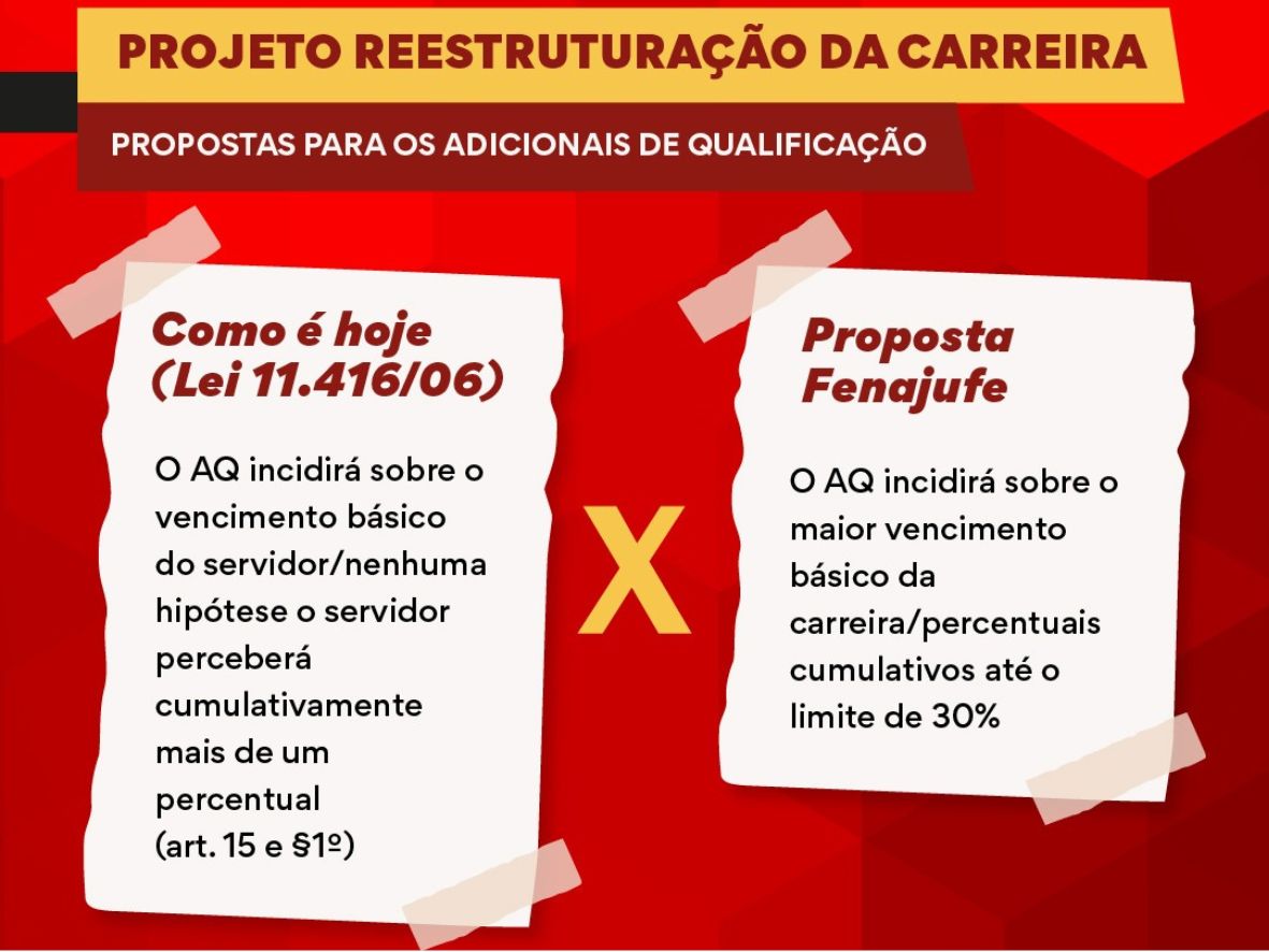 Fazem parte da proposta, que tomou como referência a carreira do Senado Federal, aumentar os percentuais dos Adicionais de Qualificação e estender o limite a 30% por acumulação, adotando o vencimento básico do cargo de analista como base de cálculo para todos os cargos, ampliar o percentual por ações de treinamento e incluí-los nos proventos de aposentadoria, além de garantir equivalência entre títulos.