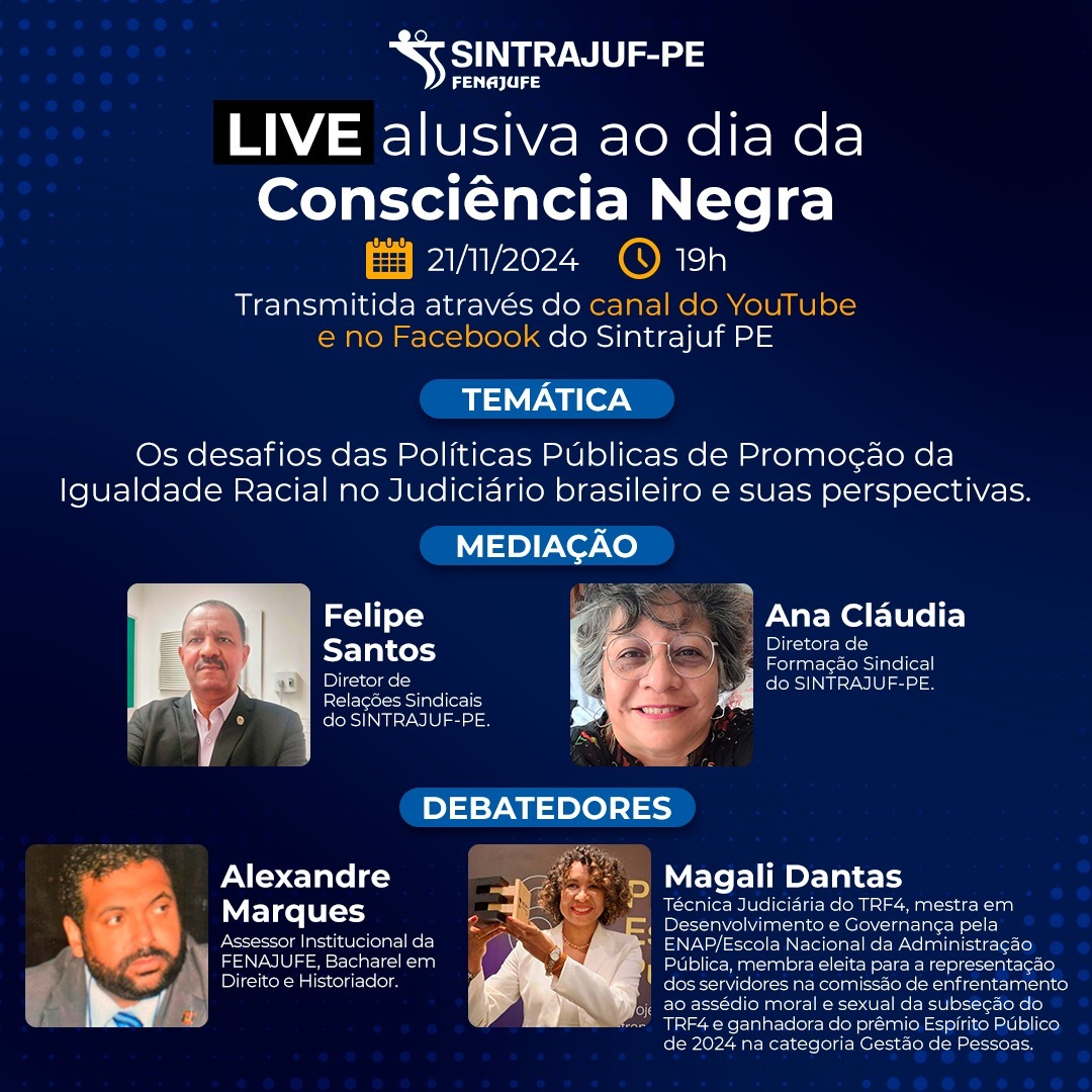 Representando o SINTRAJUF-PE na mediação do debate, estarão o diretor Felipe Santos, que integra o coletivo nacional de pretos e pretas da FENAJUFE, e a diretora Ana Cláudia Nunes de Oliveira.