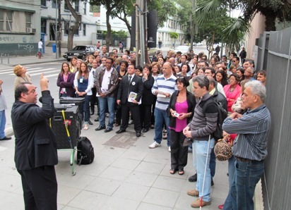 Antes de começar o ato, um pedaço da estrutura de uma passarela foi entregue ao diretor do sindicato, comprovando que o prédio tem sofrido com os abalos. “Esse pedaço de pedra caiu da estrutura de um dos prédios. Se acertasse alguém iria machucar seriamente. Temos que lutar por melhores condições de trabalho e proteger nossas vidas”, advertiu Ponciano.