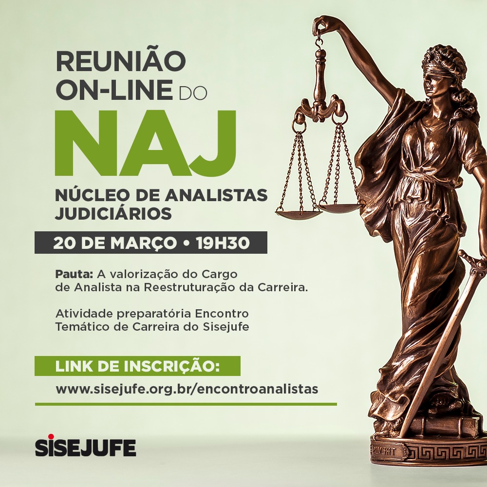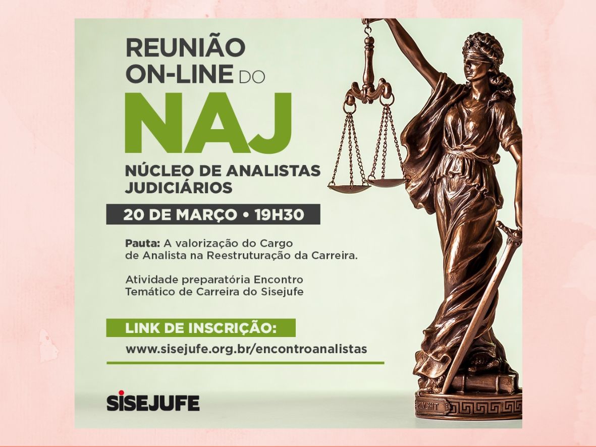 O Núcleo de Analistas Judiciário do Sisejufe (NAJ) se reunirá na segunda-feira, 20 de março, às 19:30h, pela plataforma do ZOOM, para discutir a valorização do cargo de analista judiciário na reestruturação da carreira do PJU.