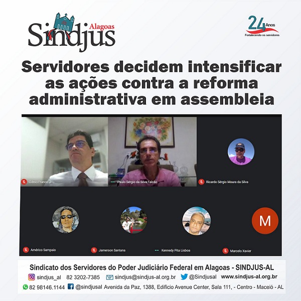 O Sindicato dos Servidores do Poder Judiciário Federal em Alagoas (Sindjus-AL) realizou uma assembleia geral virtual através da plataforma do Google Meet, na quinta-feira (06), para tratar da Reforma Administrativa – PEC 32/2020; Eleição de Delegados de Base, Observadores, Suplentes à Reunião Ampliada Extraordinária e Virtual da Fenajufe (que será realizada no dia 15 de maio); Ações judiciais contra a retirada de direitos dos aposentados (VPNI e Opção da FC) e dos Oficiais de Justiça e Avaliadores Federais (VPNI e GAE) em face de decisões do TCU; e Campanha de Solidariedade na pandemia.