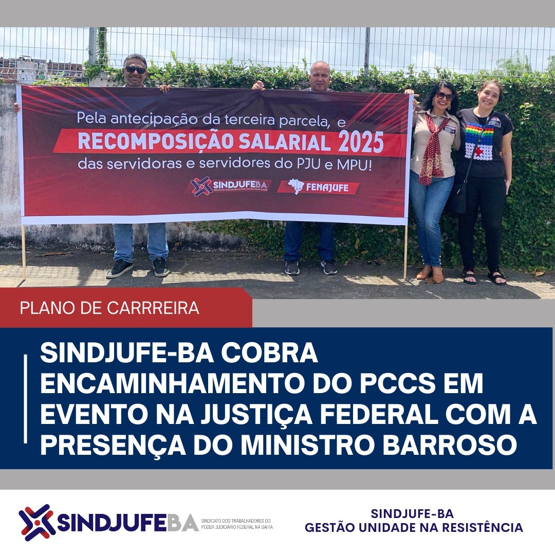 Liderada pelo dirigente Sandro Sales e pela dirigente Micheline Times, a pressão ocorreu durante o congresso “Desafios do Poder Judiciário na Contemporaneidade”, realizado na JFBA com a participação do presidente do ministro.