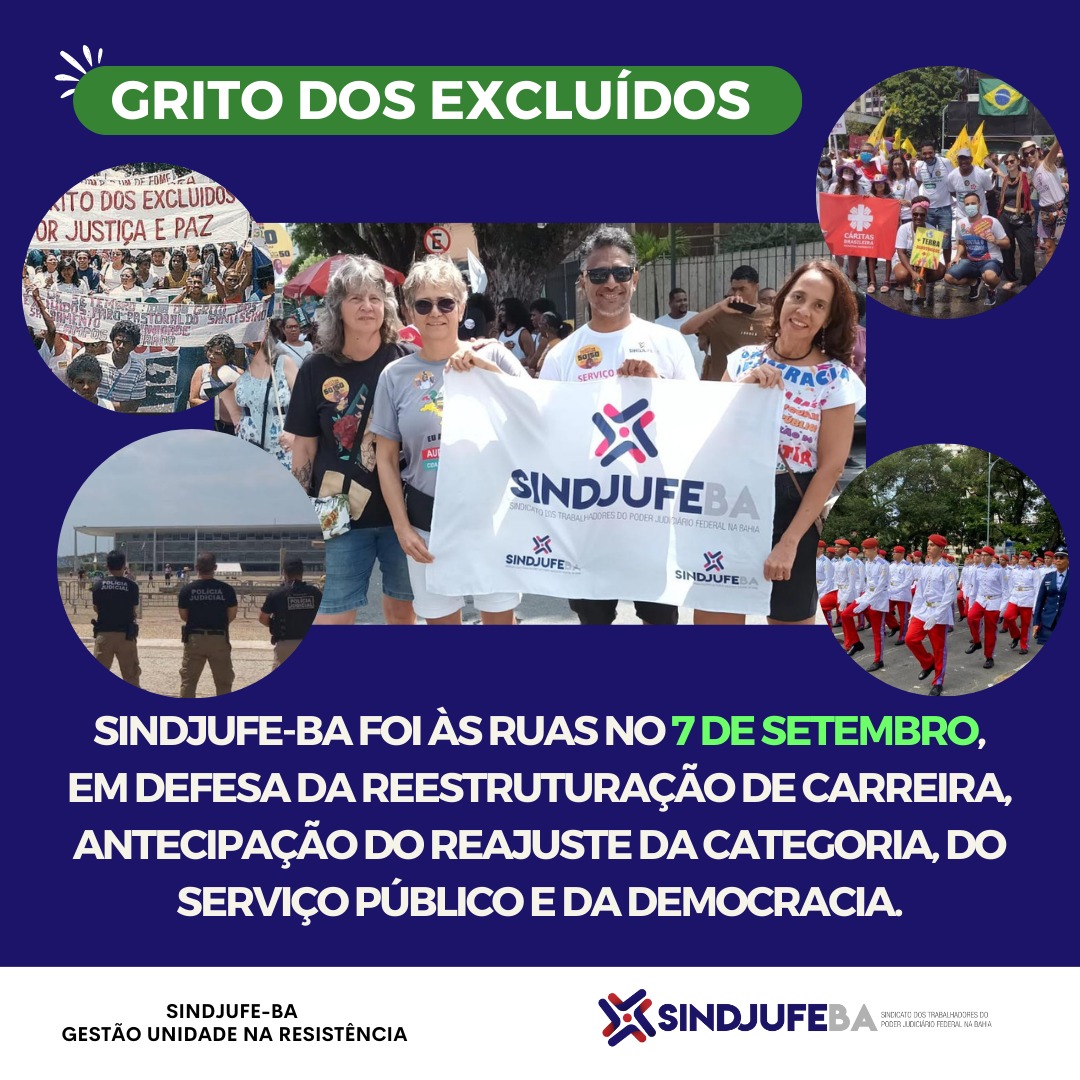 O Sindjufe-BA esteve no ato do Grito dos(as) Excluídos(as), que acontece tradicionalmente há 30 anos no dia 7 de setembro. Em Salvador, milhares de pessoas se reúnem anualmente nas ruas para lembrar da Independência do Brasil, mas também para levar suas pautas e reivindicações na busca de dias melhores para todas e todos. Nesse ano, reforçamos a importância da reestruturação de cargos e carreiras e a luta pela antecipação da parcela do reajuste para os servidores prevista para 2025 além da defesa do serviço público e da democracia.