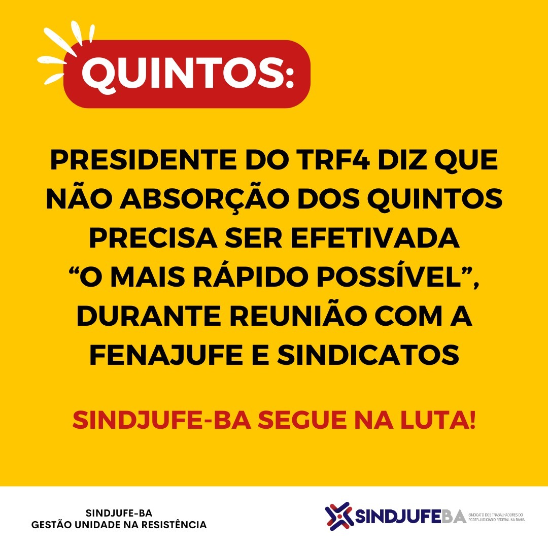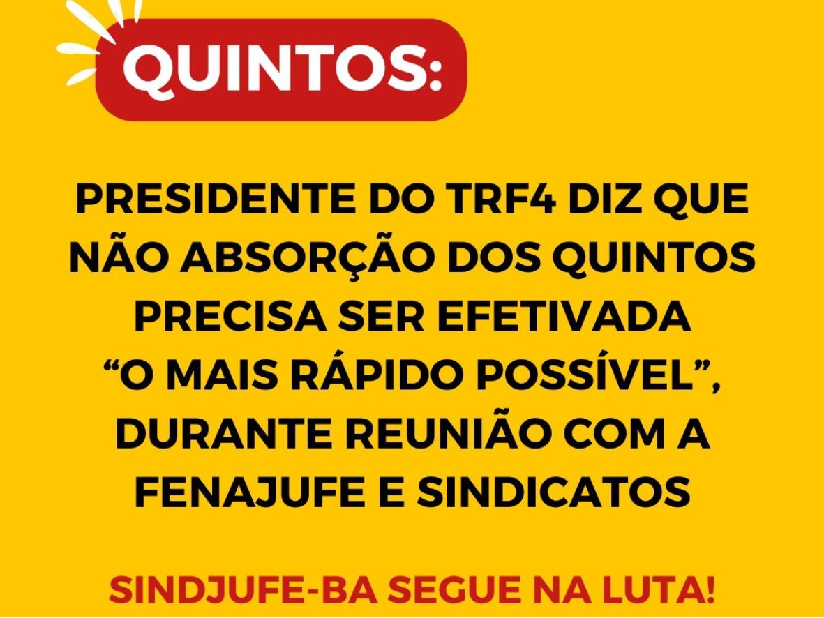 Nesta quarta-feira, 7, estivemos em reunião com o presidente do TRF4, desembargador Fernando Quadros da Silva, que também é conselheiro do CJF, para tratar de duas pautas que têm tirado o sono de muitas(os) trabalhadoras(es) que é o pagamento de valores atrasados de quintos e a não absorção dos quintos nas parcelas de reposição salarial. Ou seja, apenas um direito que já foi adquirido, que já tem lei, a 14.687/2023, mas que ainda não vem sendo cumprido pelos órgãos.
