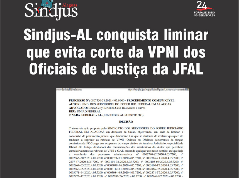 O Sindicato dos Servidores do Poder Judiciário Federal em Alagoas (Sindjus-AL) conquistou medida liminar que determina a União Federal de se abster de realizar qualquer ato tendente a suprimir as rubricas de VPNI(Quintos) decorrentes da função comissionada FC-5 paga aos ocupantes do cargo efetivo de Analista Judiciário, especialidade Oficial de Justiça Avaliador) das remunerações dos Oficiais de Justiça que percebem cumulativamente as rubricas de VPNI e GAE, até que sejam efetivamente julgados os processos administrativos individuais.