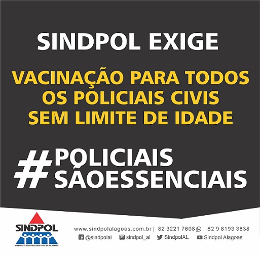 O Sindicato dos Policiais Civis de Alagoas (Sindpol) exige a vacinação contra a covid-19 para todos os policiais civis sem limitação de idade. Em três dias, morreram três policiais civis ( Manoel Wanderley, José Ferreira Severiano Lima e Paulo Casado Farias Neto), vítimas da covid-19.