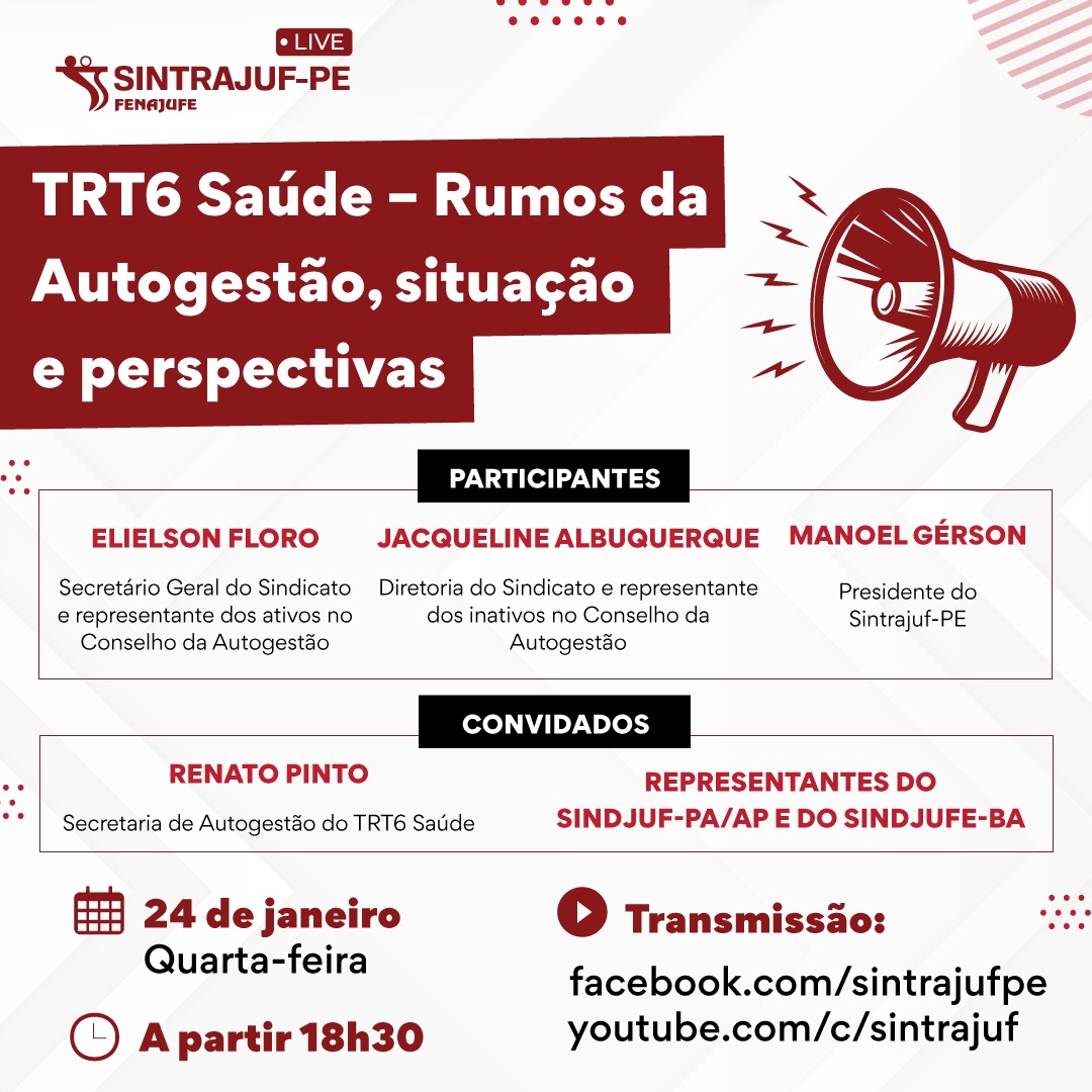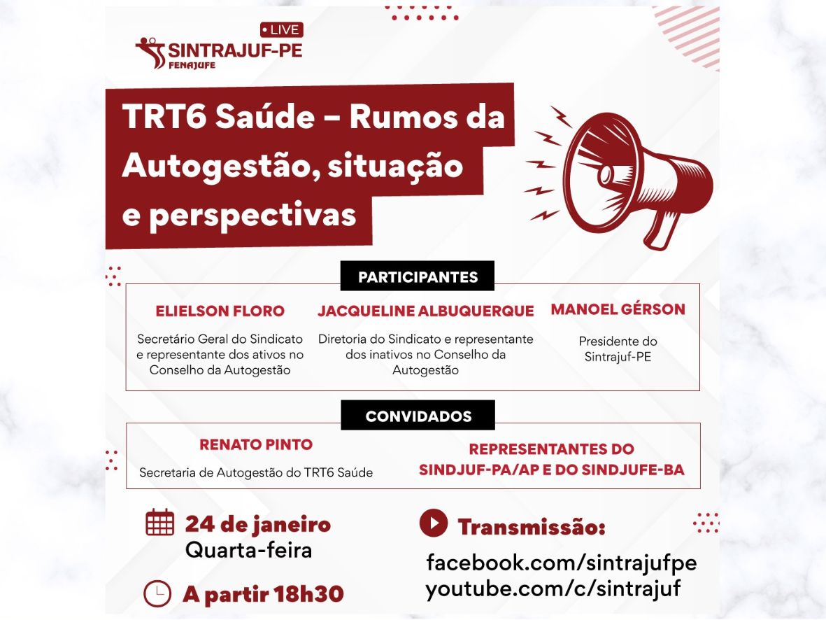 O Sintrajuf-PE convida a categoria a participar da nossa live, hoje, quarta-feira (24), a partir das 18h30, que vai debater sobre o plano de autogestão em Saúde do Tribunal Regional do Trabalho da 6ª Região (TRT6). O tema será “TRT6 Saúde – Rumos da Autogestão, situação e perspectivas”.