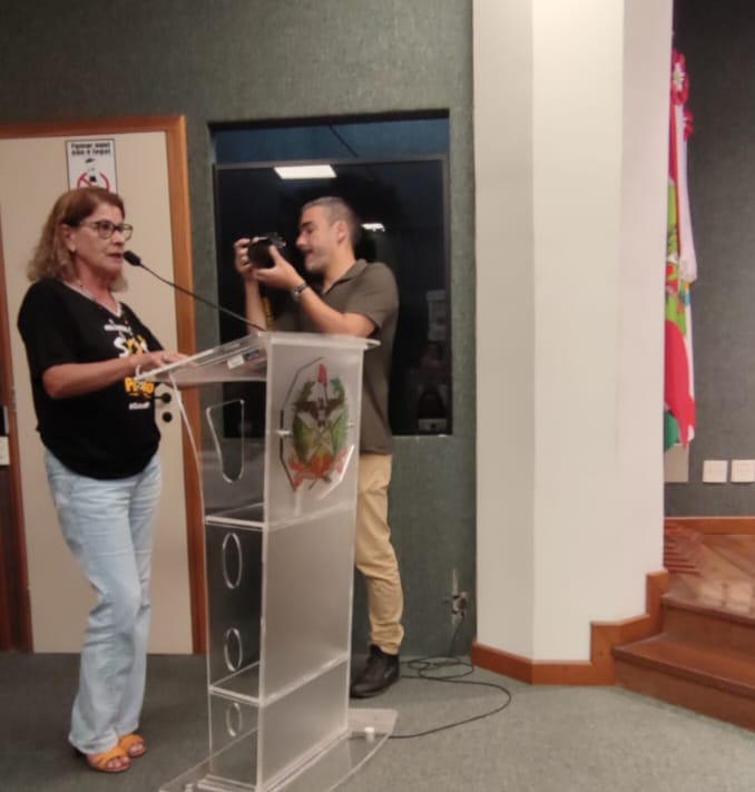 A coordenadora do Sintrajusc Maria José Olegário participou do lançamento da Frente Parlamentar em Defesa do Serviço Público e das Empresas Públicas, que ocorreu na terça (11) no Plenarinho da Alesc.
