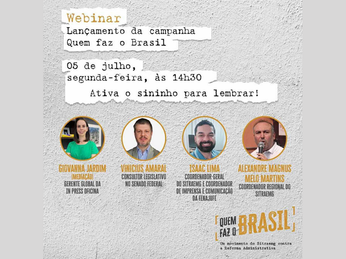 O tema será abordado por Isaac Lima, coordenador-geral do sindicato e diretor da Fenajufe; Alexandre Magnus, coordenador regional do sindicato; e por Vinícius Amaral, consultor do Senado que elaborou nota técnica sobre a Reforma Administrativa. A mediação será de Giovanna Jardim, gerente global da In Press Oficina, empresa responsável pelo desenvolvimento da campanha.