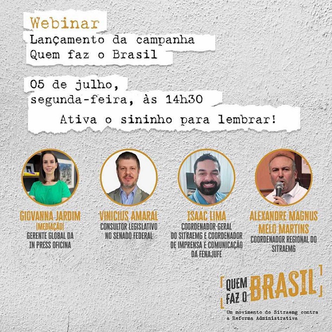 O Sitraemg convida os servidores do Judiciário Federal em Minas Gerais para a webinar que será realizada na segunda-feira (05/07), às 14h30, com transmissão ao vivo pelo canal do sindicato no Youtube e pela página no Facebook. A live marcará o lançamento oficial da campanha “Quem faz o Brasil – Um movimento do Sitraemg contra a Reforma Administrativa”.