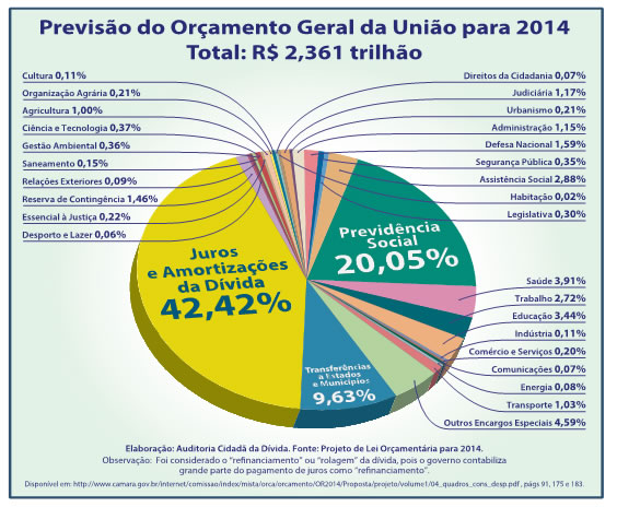 Enquanto a dívida absorverá mais de 42% dos recursos orçamentários em 2014, a saúde ficará com menos de 4% e a educação com pouco mais de 3%. Os transportes receberão apenas 1% dos recursos e a segurança pública bem menos: 0,35%.