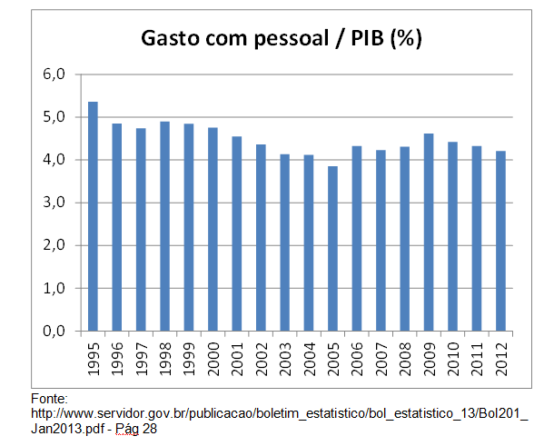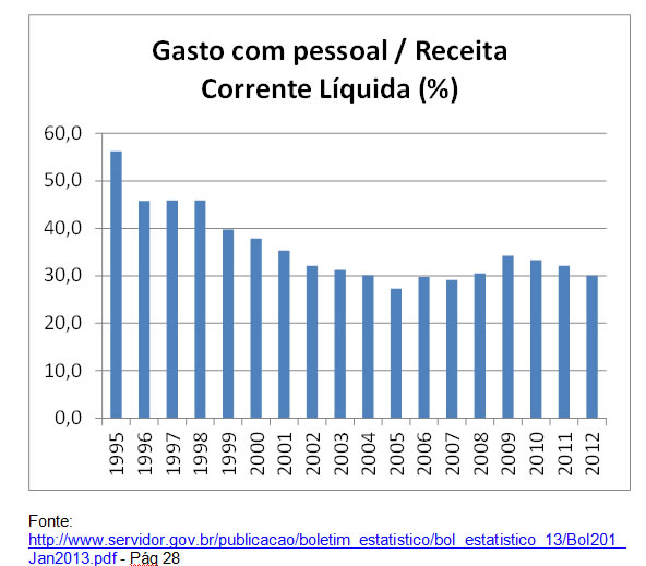 De 1995 até 2012, o gasto com pessoal passou por significativa queda, tanto se compararmos com a evolução da Receita Corrente Líquida como com o PIB, conforme gráficos:
