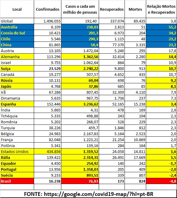 Na Austrália houve 55 recuperados para cada óbito, seguida da Coréia do Sul com 34, Chile com 23, China com 23, Áustria com 17 e Alemanha com 14 recuperados para cada óbito.