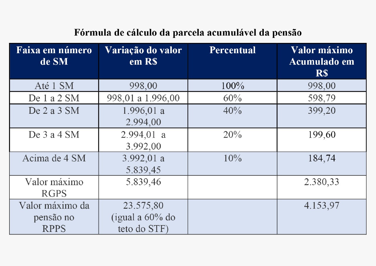 Isto significa que a acumulação, que antes era integral até o teto do INSS para os segurados do Regime Geral de Previdência Social (RGPS), agora será, no melhor cenário, de R$ 2.380,33. No caso de servidor público da União, a parcela acumulável será de, no máximo, R$ 4.153,97. Antes, a pensão concedida a partir de 2004 podia atingir até R$ 29.256,00, já que calculada até o teto do serviço público federal, atualmente de R$ 39.293,00. Isso porque, com a nova regra de cálculo da pensão, o cônjuge só fará jus a 60% do valor do provento, que, calculado sobre o teto de remuneração (R$ 39.293,00), resulta em um máximo de R$ 23.575,00. Mas, em caso de acumulação, só será possível receber 10% da parcela acima de 4 salários mínimos, ou seja, R$ 1.958,00, que, somado ao valor aplicado sobre as demais faixas, resulta no valor máximo de R$ 4.153,97.