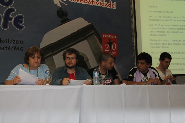 Foi com a leitura e a aprovação do Regimento Eleitoral que os congressistas reiniciaram os trabalhos na manhã desta segunda-feira, 29, no 8º Congrejufe, Congresso da Fenajufe que acontece no Hotel Tauá Resorts, na cidade mineira de Caeté, entre os dias 26 e 30 de abril. Originalmente agendada para o final da tarde de domingo, 28, a plenária relativa a esta atividade foi remarcada como primeira atividade de hoje, devido ao avanço noite adentro dos trabalhos de ontem.