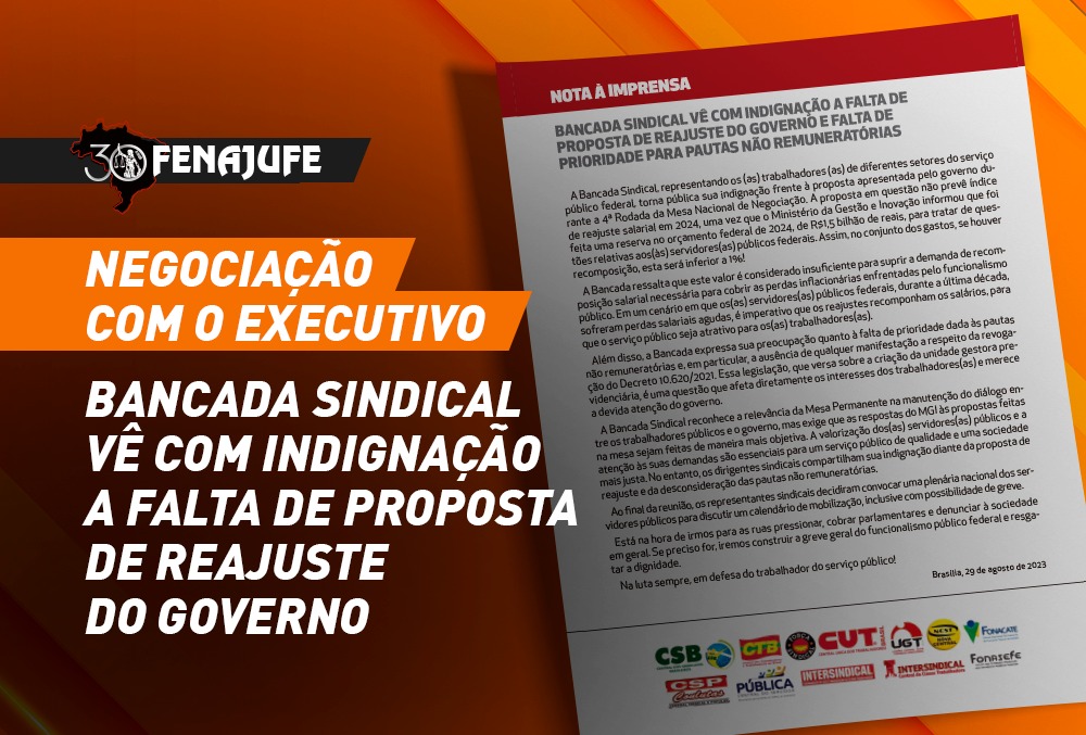 A Bancada Sindical, representando os (as) trabalhadores (as) de diferentes setores do serviço público federal, torna pública sua indignação frente à proposta apresentada pelo governo durante a 4ª Rodada da Mesa Nacional de Negociação. A proposta em questão não prevê índice de reajuste salarial em 2024, uma vez que o Ministério da Gestão e Inovação informou que foi feita uma reserva no orçamento federal de 2024, de R$1,5 bilhão de reais, para tratar de questões relativas aos(às) servidores(as) públicos federais. Assim, no conjunto dos gastos, se houver recomposição, esta será inferior a 1%!