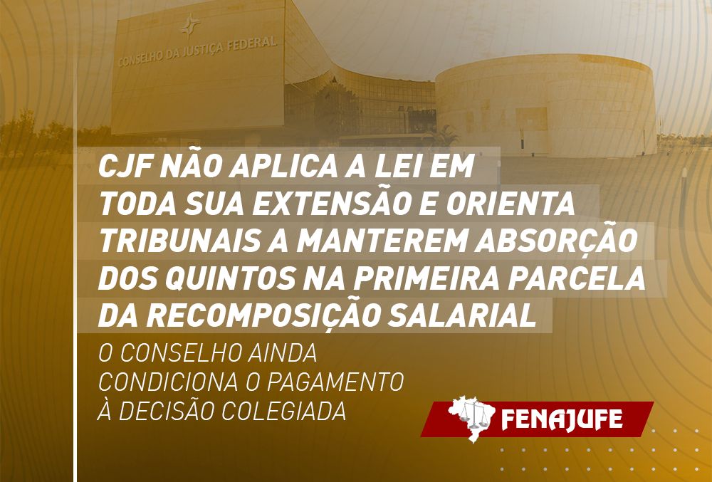 O Conselho da Justiça Federal (CJF) emitiu despacho orientando os tribunais a manterem a absorção dos quintos na primeira parcela da recomposição salarial das servidoras e servidores, descumprindo a extensão da Lei n° 14.687/2023 – que dispõe sobre a criação de funções comissionadas de cargos efetivos no Quadro de Pessoal do Conselho Nacional de Justiça (CNJ) –, e entre outros pontos, determina que os quintos e décimos não podem ser reduzidos ou compensados por reajustes remuneratórios.