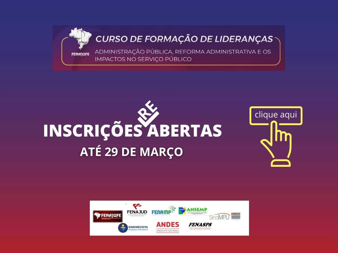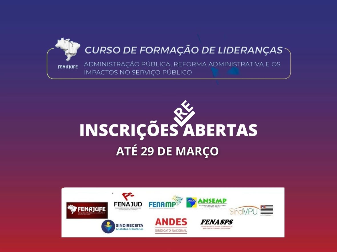 Uma noite para ficar na história da Fenajufe e das entidades parceiras na mega iniciativa de formação. Assim está definida a aula inaugural de 16 de março, do Curso de Formação de Lideranças com foco na Administração Pública, a Reforma Administrativa e os impactos sobre os Serviços Públicos. Com recorde de inscrições – 1.710 inscritos até 15 de março – a Organização definiu pelas aulas abertas via YouTube, além de prorrogar o prazo para novas inscrições (inscreva-se aqui ou clique na imagem ao lado) até a segunda-feira, 29 de março. Outra definição da Comissão Organizadora foi pela manutenção das aulas no YouTube e com isso, garantir maior participação e repercussão.