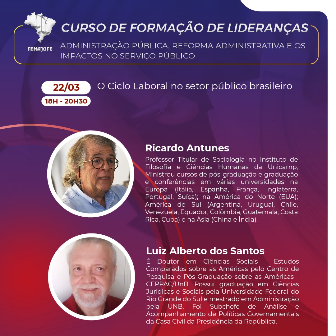 O tema da segunda aula será “O Ciclo Laboral no Serviço Público”, a cargo dos professores Ricardo Antunes e Luiz Alberto dos Santos. Conheça: