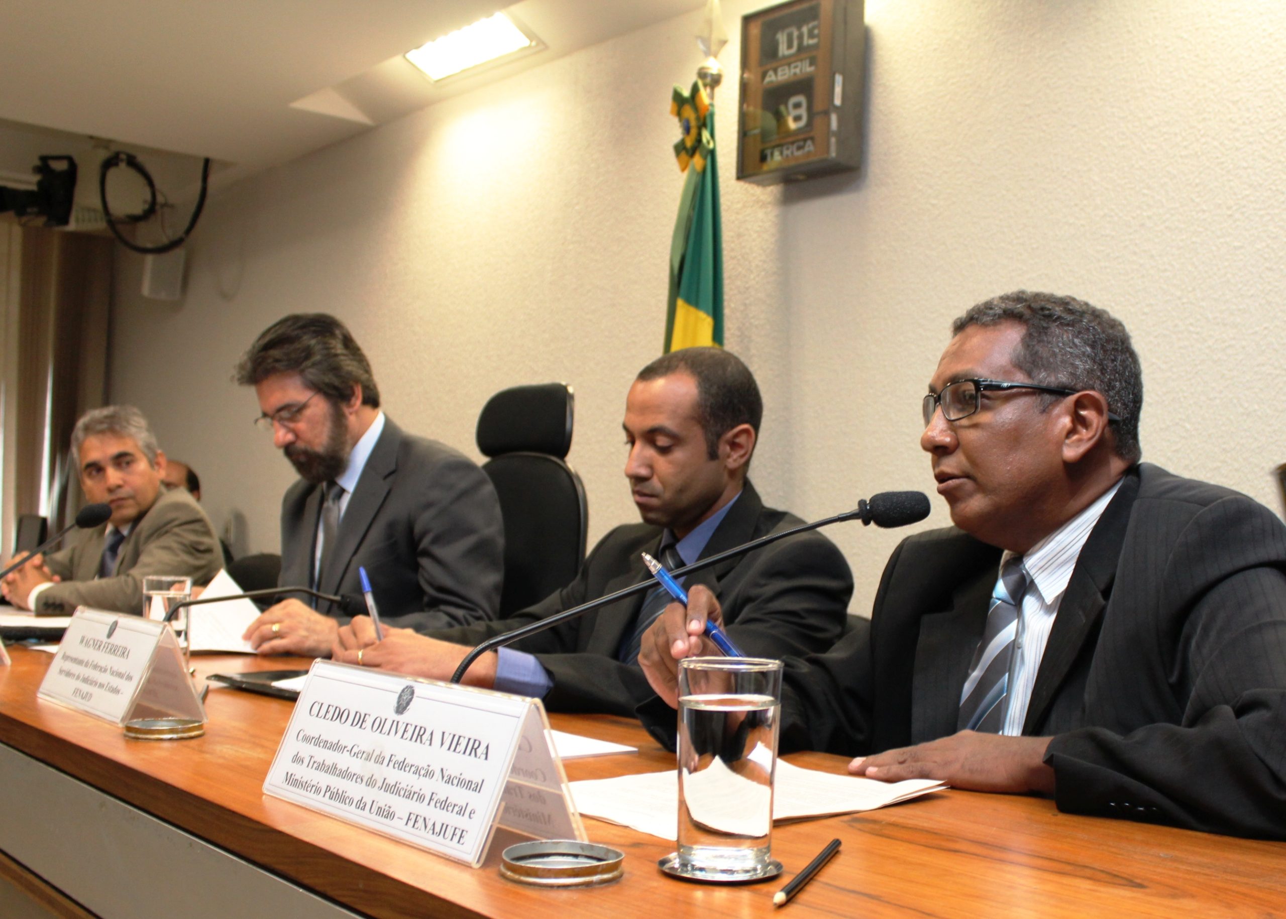 Nesta terça-feira (08/04), a CCJ (Comissão de Constituição e Justiça) do Senado realizou uma audiência pública para debater a PEC (Proposta de Emenda à Constituição) 59/13, que dispõe sobre a criação do Estatuto do Servidor do Poder Judiciário. A Fenajufe participou da mesa da audiência, representada pelos coordenadores Cledo Vieira e João Batista. Eles ratificaram a posição contrária à aprovação da proposta, conforme deliberação do congresso da categoria. A Fenajud, Federação dos servidores do Judiciário nos Estados, participou dos debates como principal interessada na proposta, sendo representada por seu dirigente Wagner Ferreira e pelo deputado Manoel Júnior (PMDB/PB), relator da PEC na Câmara. A audiência foi presidida pelo presidente da CCJ, senador Vital do Rêgo (PMDB/PB), e contou com a participação do senador Valdir Raupp (PMDB/RO), relator da PEC 59/13.