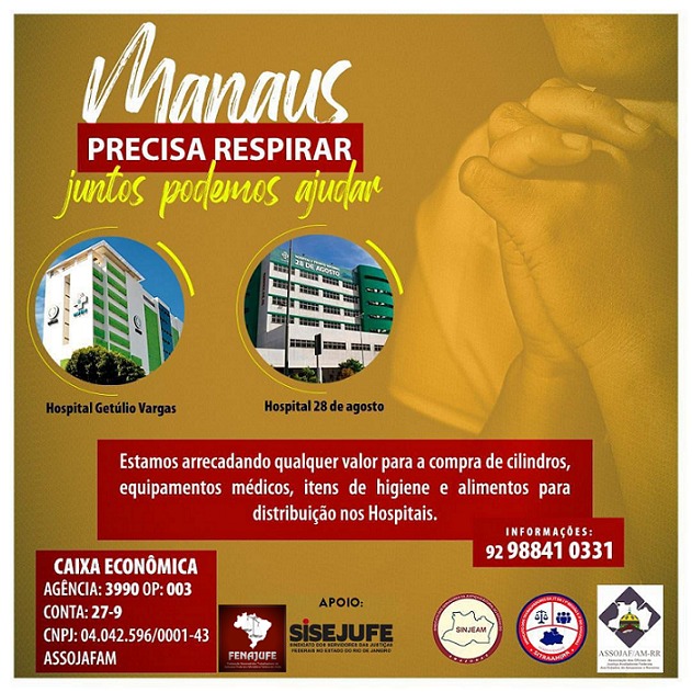 A capital amazonense enfrenta o avanço desenfreado de casos e mortes por Covid-19. Até o fechamento desta, o estado contabiliza o total de 232.434 casos com 6.308 mortes. O Sindicato dos Servidores da Justiça do Trabalho da 11ª Região (Sitraam/RR), lançou campanha de solidariedade e ajuda ao povo amazonense no último domingo (17).