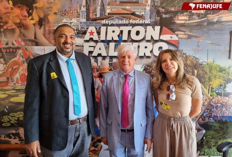 A Fenajufe continuou nessa quarta-feira (13) o trabalho de articulação na Câmara dos Deputados em defesa das aposentadorias e pensões no serviço público. A Federação esteve no gabinete do deputado Airton Faleiro (PT-PA) para tratar das PECs 555/2006 e PEC Social 6/2024 (contribuição previdenciária das servidoras e servidores aposentados) e da PEC 133/2019 — que revê as regras para aposentadoria especial de servidores com deficiência (PCDs).