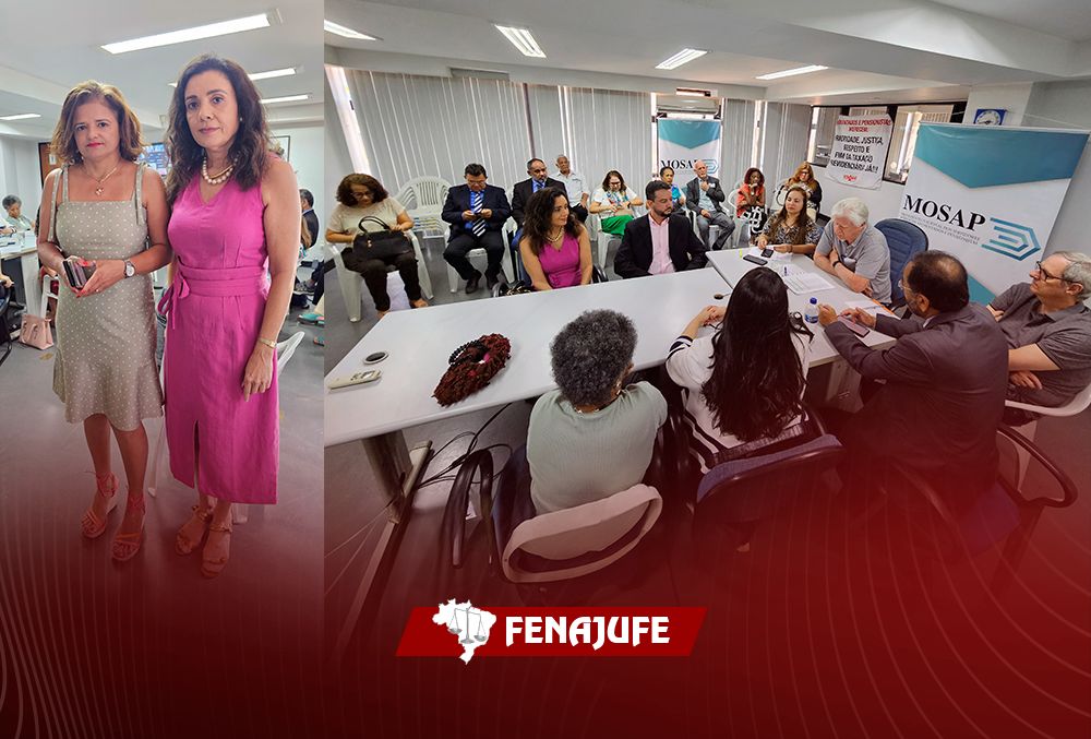 A Fenajufe, em conjunto com demais entidades sindicais, participou de reunião no Instituto Mosap (Movimento Nacional dos Servidores Públicos Aposentados e Pensionistas) nessa terça-feira (17), em Brasília. Na ocasião, a Federação defendeu a construção de uma mobilização nacional pelo fim do confisco previdenciário de servidoras e servidores públicos(as), como forma de pressionar deputadas e deputados a apresentarem os 300 requerimentos exigidos pelo presidente da Câmara, Arthur Lira (PP-AL), para acatar o apensamento da PEC 06/24 à 555/06 que tratam do tema.