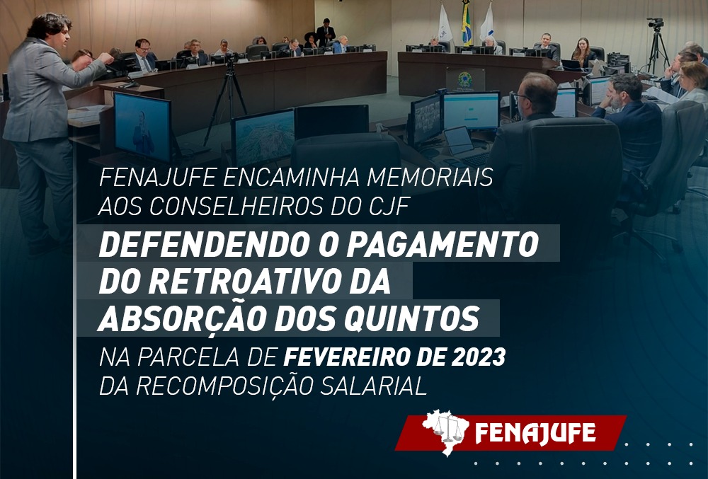 A Fenajufe encaminhou, nessa quarta-feira (13), memoriais a todos os conselheiros do Conselho da Justiça Federal (CJF) defendendo o pagamento do retroativo da absorção dos quintos na parcela de fevereiro de 2023 da recomposição salarial. A próxima sessão do órgão está prevista para ocorrer na segunda-feira (18), às 14h.