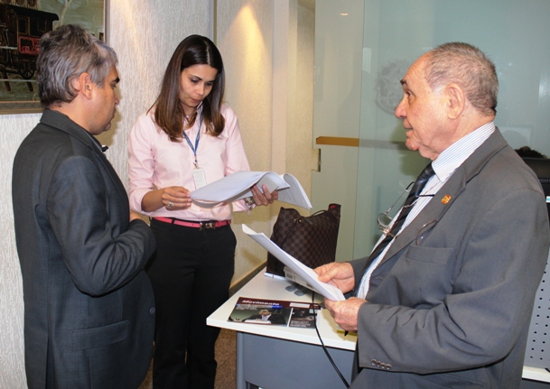 Os coordenadores da Fenajufe, João Batista e João Evangelista, estiveram nesta quarta-feira (02/07) no gabinete do senador Valdir Raupp (PMDB/RO), relator da (PEC) 59/2013, que dispõe sobre o Estatuto dos Servidores do Poder Judiciário. Na ocasião, eles entregaram para a assessora do senador, Karina Bernardino Lesch, nota técnica do CNJ (Conselho Nacional de Justiça) pela não aprovação da proposta.