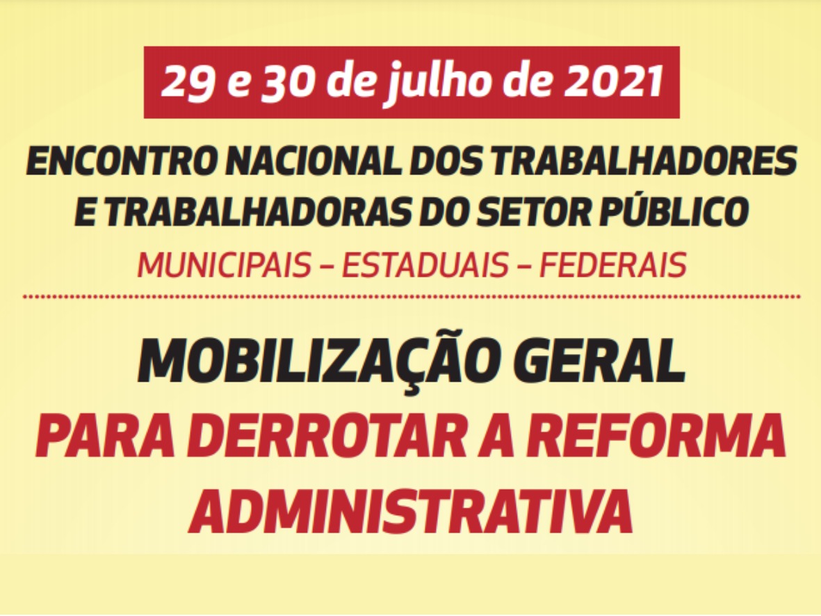 O Encontro Nacional das Trabalhadoras e Trabalhadores das Três Esferas, se iniciará com Ato Político Virtual contra a PEC/32 no dia 29 e se estenderá até o dia 30 de julho. Ao final, o evento fará o lançamento do Plano Nacional de Mobilização Contra a Reforma Administrativa.
