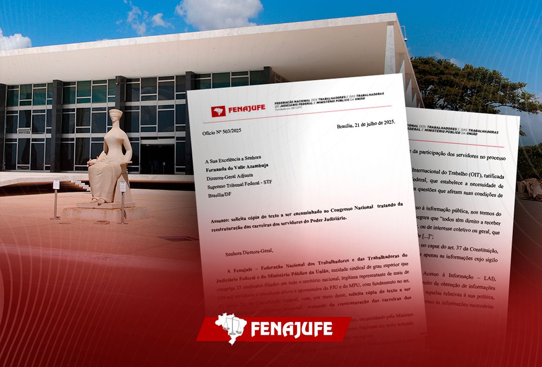 A Fenajufe encaminhou, nesta segunda-feira (21), ofício ao Supremo Tribunal Federal (STF) solicitando acesso à minuta do texto que será enviado ao Congresso Nacional sobre a reestruturação da carreira das servidoras e servidores do Poder Judiciário da União (PJU).