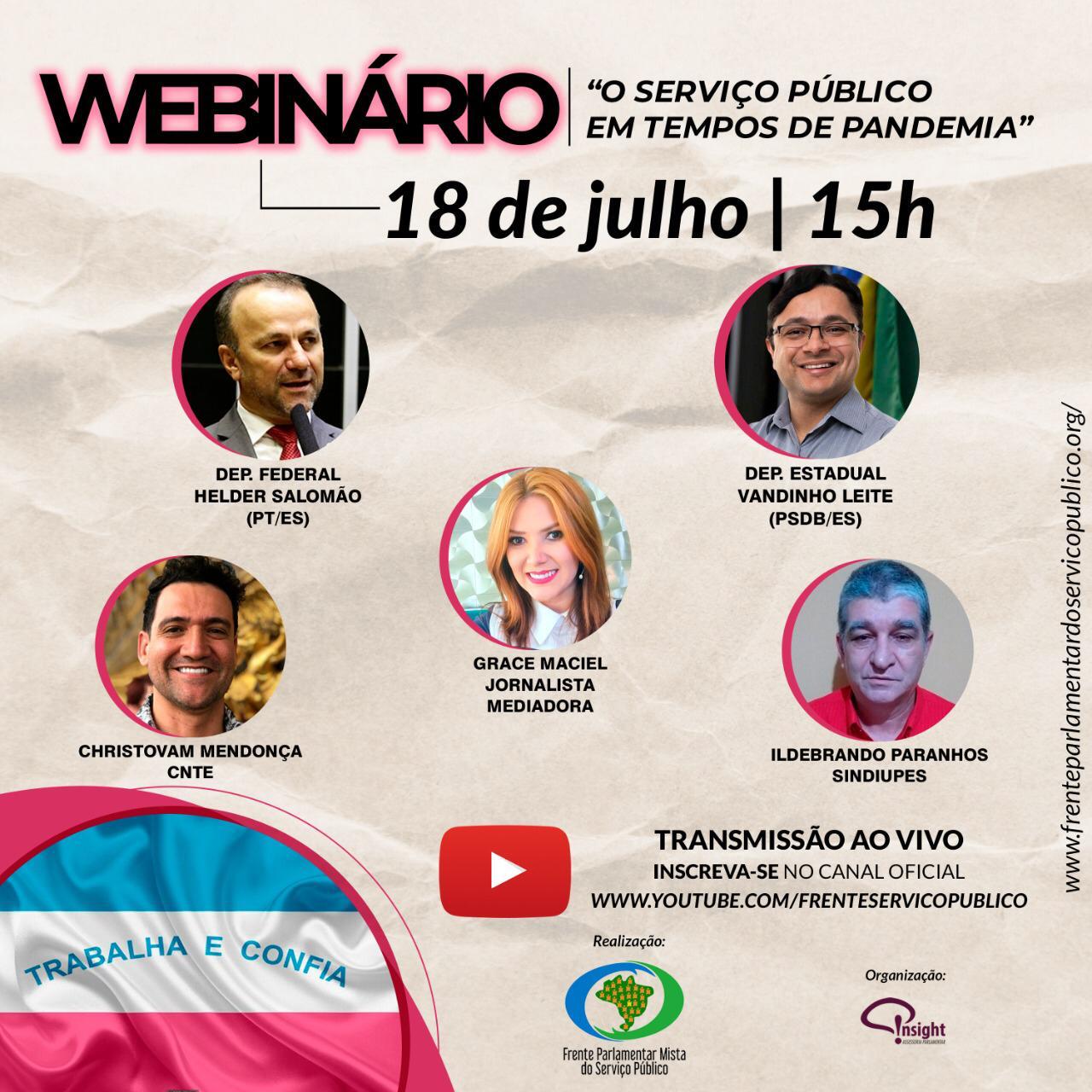 A Frente Parlamentar Mista do Serviço Público promove, neste sábado (18), às 15h, o sexto webinário “O Serviço público em tempos de pandemia” ao vivo no Youtube e será organizado por entidades do estado do Espírito Santo (ES).