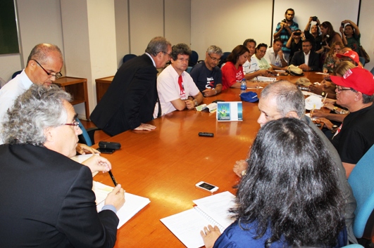 Durante a reunião o diretor Saulo Arcangeli disse ao secretário “que o governo desrespeita os servidores ao não responder à pauta conforme prometido. Além disso a presidente Dilma condiciona a discussão sobre a negociação coletiva à regulamentação do direito de greve e mantém o desrespeito à data-base, lembrando inclusive do Recurso Extraordinário (RE) 565089 que trata do tema e encontra-se no STF, informando, ainda, que consta da pauta da federação encaminhada e discutida no Supremo e que poderá a qualquer momento entrar em pauta, conforme pedido da federação em recente reunião com o presidente Joaquim Barbosa”.