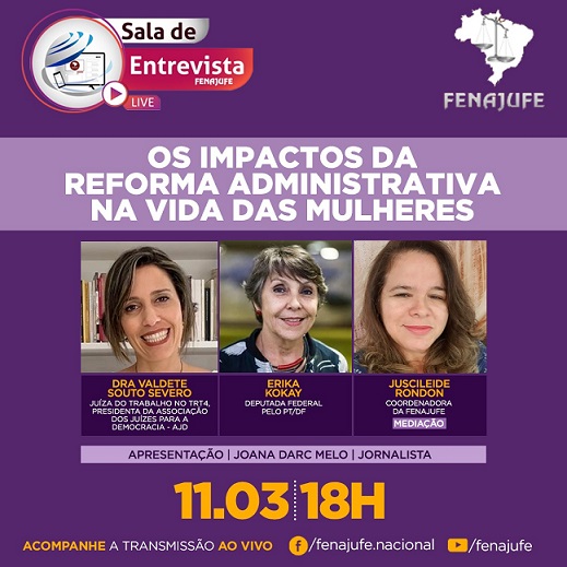 O Programa Sala de Entrevista – Especial Live de quinta feira (11) realizará um debate sobre os impactos da Reforma Administrativa na vida das Mulheres. A Proposta de reforma (PEC32) deverá ser votada no segundo semestre e em caso de aprovação irá trazer muitos prejuízos não só para as servidoras mas para toda a sociedade que depende dos serviços.