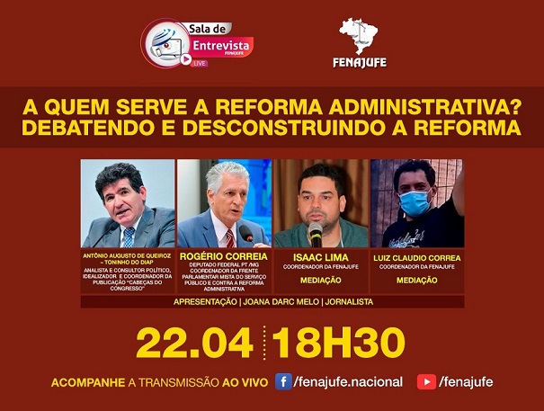A quem serve a Reforma Administrativa? Com essa provocação a Fenajufe convidou o deputado federal Rogério Correia, que é um dos coordenadores da Frente Parlamentar Mista do Serviço Público e o Analista e Consultor Político, Antônio Augusto Queiroz, o Toninho do DIAP- para pontuar os efeitos nocivos e destrutivos da PEC32.
