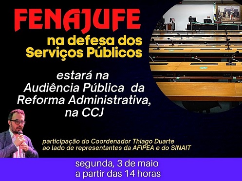 A Fenajufe vai participar da próxima audiência pública sobre a PEC32 que ocorrerá na segunda-feira (3), às 14 horas. Das entidades sindicais confirmadas, além da Federação, o Sindicato Nacional dos Servidores do IPEA (AFIPEA) e o Sindicato Nacional dos Auditores Fiscais do Trabalho (SNAIT) também estarão presentes, além de entidades favoráveis a PEC 32.