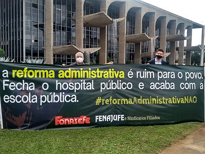 A Fenajufe participou, nesta sexta-feira (30), do ato organizado pelo Fórum das Entidades Nacionais dos Servidores Públicos Federais (Fonasefe) em defesa do serviço público, da vacina para todos e contra a reforma administrativa (PEC 32/20). Os coordenadores Fernando Freitas e Roberto Policarpo participaram respeitando, claro, todas as medidas de segurança sanitária.