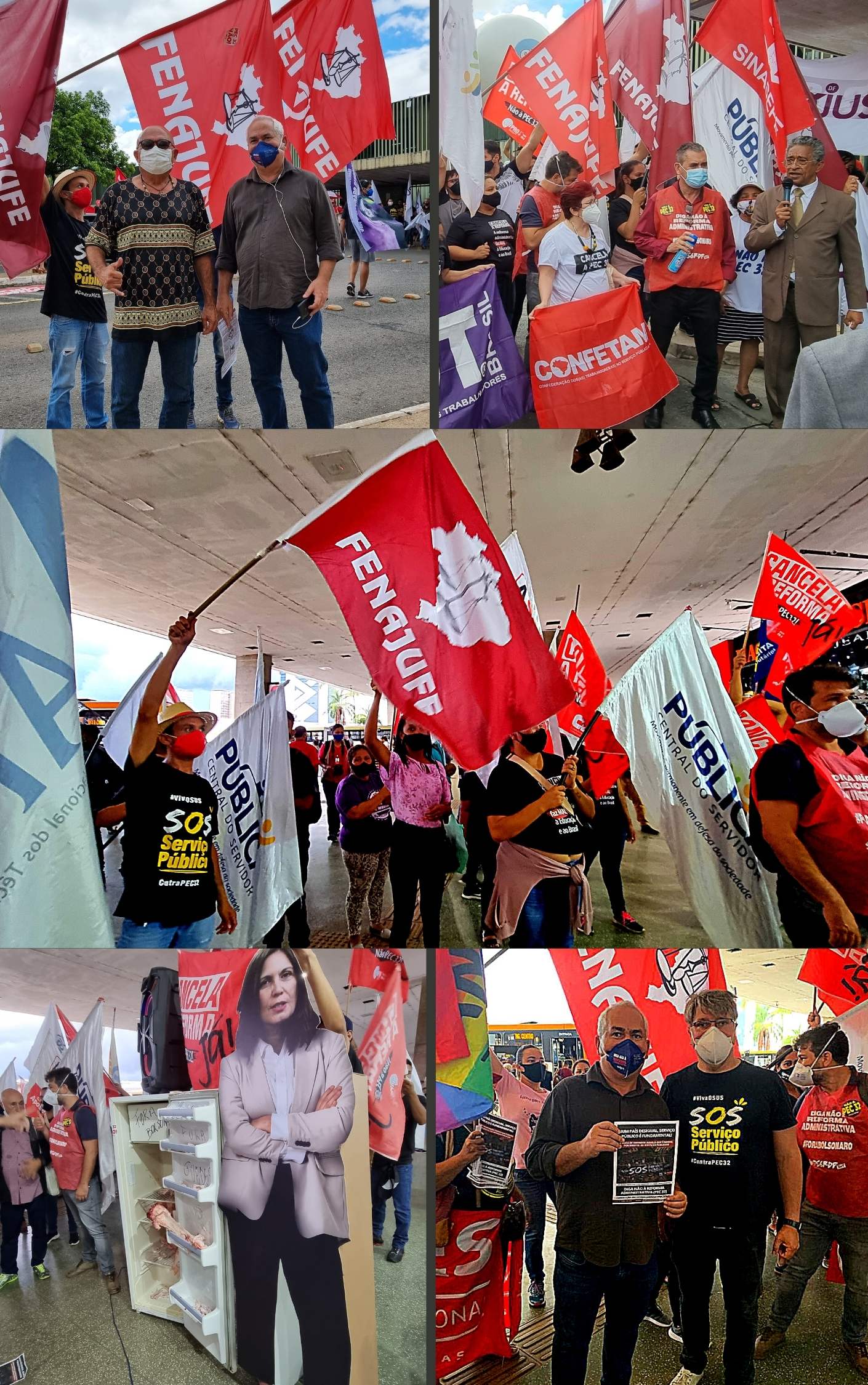Logo depois, às 4 da tarde, a mobilização contra a reforma administrativa em Brasília realizou panfletaço na rodoviária do Plano Piloto. O objetivo foi o de estar mais próximo das comunidades que serão bombardeadas pelos efeitos desastrosos da PEC 32/20, mostrando a elas o que realmente a acontece quando se tem “estado mínimo” e “redução de servidores(as)” à disposição da população.
