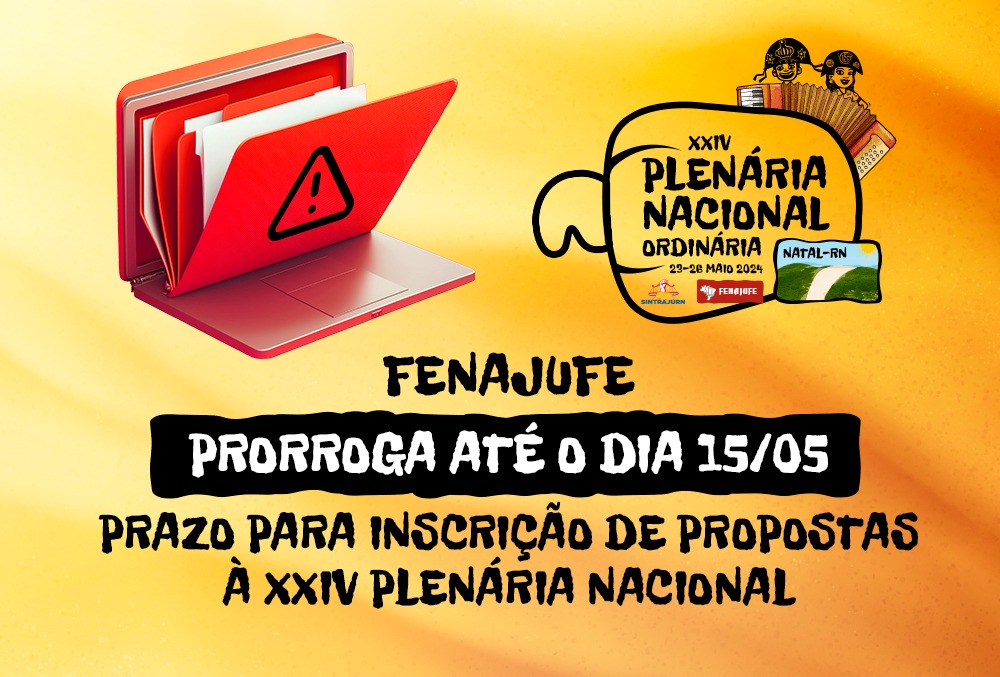 A comissão organizadora da XXIV Plenária Nacional da Fenajufe decidiu prorrogar o prazo para as inscrições de propostas de resoluções no sistema. Agora, delegados(as) e observadores(as) terão até o dia 15/05, próxima quarta-feira, às 19h, para o cadastramento das proposições na Plataforma de Gerenciamento de Eventos da Federação; o prazo seria encerrado na terça-feira (7).