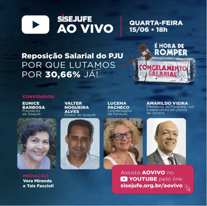 O sindicato do Rio vai realizar neste dia (15/6), às 18h, a live “Reposição Salarial do PJU – Por que lutamos por 30,66% Já!”, com transmissão pelo Youtube e Facebook e retransmissão pela Fenajufe e sindicatos parceiros.