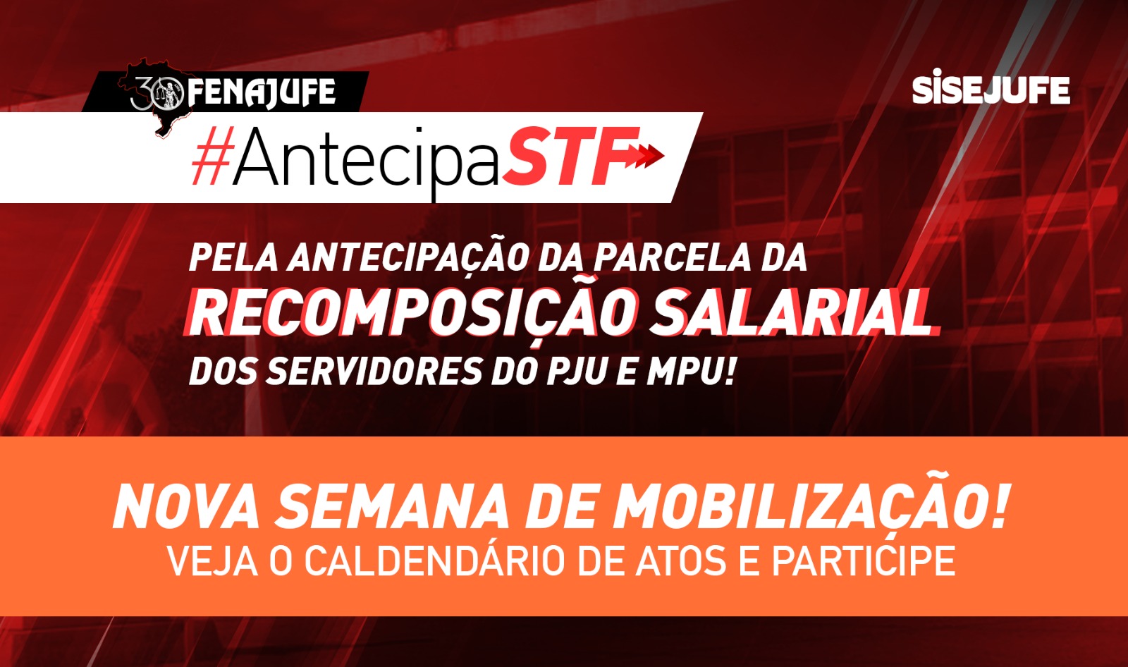 Na primeira semana de setembro, a Fenajufe convocou os sindicatos de base de todo o Brasil a intensificarem a campanha pela antecipação da última parcela da recomposição salarial. Em ofício, a entidade divulgou também um calendário de mobilização com atividades nos estados e em Brasília.