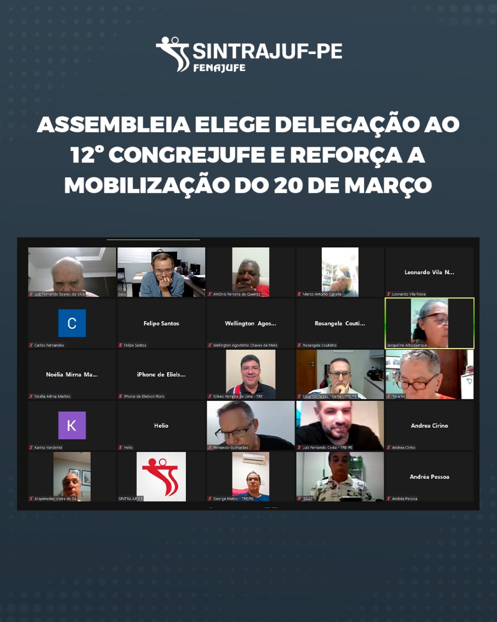 A Assembleia Geral do SINTRAJUF-PE reuniu-se na noite da última quinta-feira (13) para debater o cenário político-administrativo no Judiciário e eleger a sua delegação de representantes para o 12º Congresso Nacional da FENAJUFE – CONGREJUFE, que ocorre entre 26 de abril e 1º de maio, no Paraná.