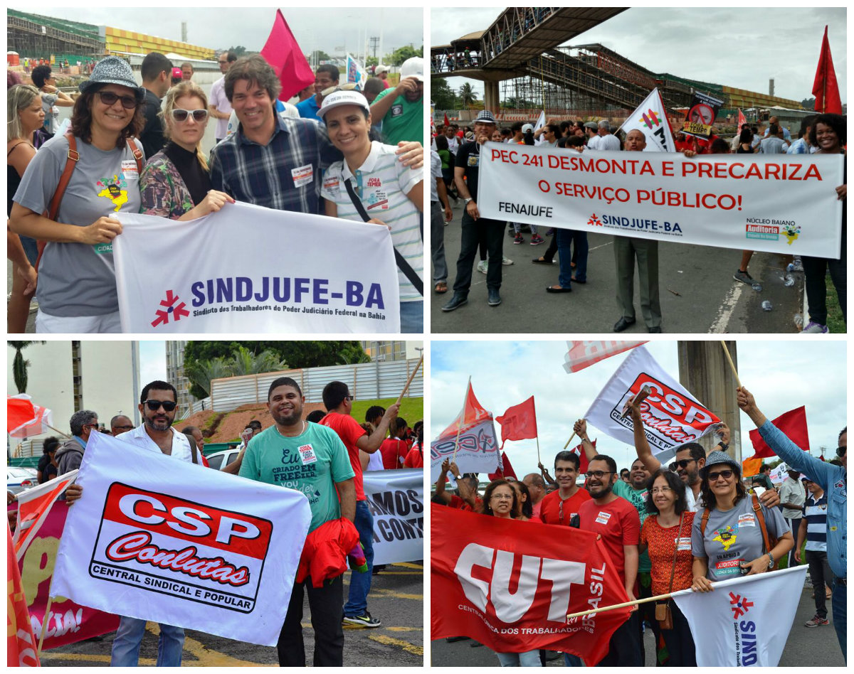 A categoria do Judiciário Federal na Bahia deliberou em Assembleia paralisação neste dia (11) com participação em ato unificado. Servidores protestaram contra o retrocesso de direitos. “Vamos ver o Brasil quebrar ao longo destes 20 anos. É preciso fazer alguma coisa para evitar isso. Por isso, estamos aqui para evitar que aconteça. O Serviço Público vai parar e vamos ver o dinheiro dos brasileiros sendo transferidos para os banqueiros”, protestou a diretora sindical do SINDJUFE-BA, Denise Carneiro.