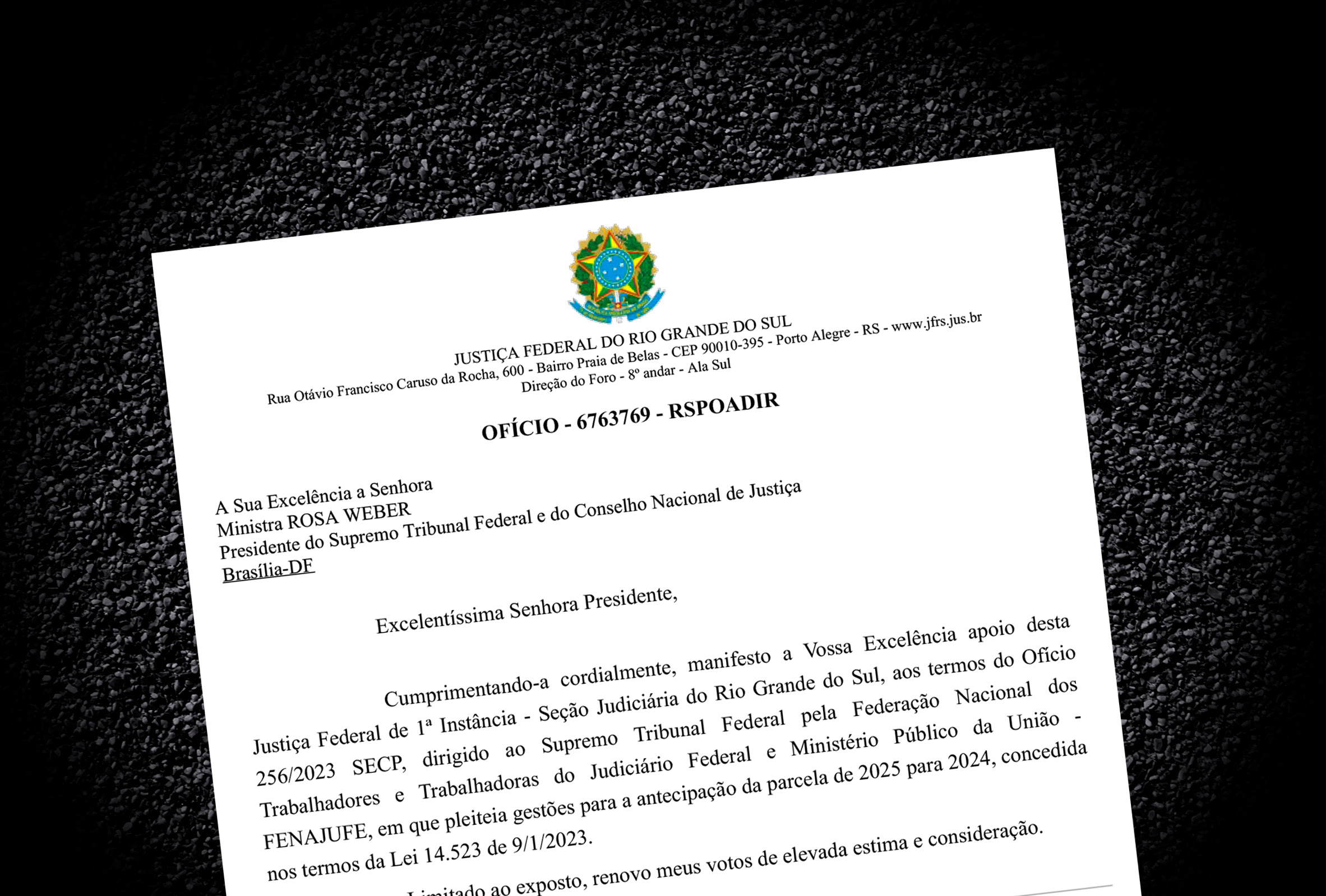 A partir disso, no documento ao STF e ao CNJ, juíza federal Carla Evelise Justino Hendges afirma: “manifesto a Vossa Excelência apoio desta Justiça Federal de 1ª Instância – Seção Judiciária do Rio Grande do Sul, aos termos do Ofício 256/2023 SECP, dirigido ao Supremo Tribunal Federal pela Federação Nacional dos Trabalhadores e Trabalhadoras do Judiciário Federal e Ministério Público da União – FENAJUFE, em que pleiteia gestões para a antecipação da parcela de 2025 para 2024, concedida nos termos da Lei 14.523 de 9/1/2023”.