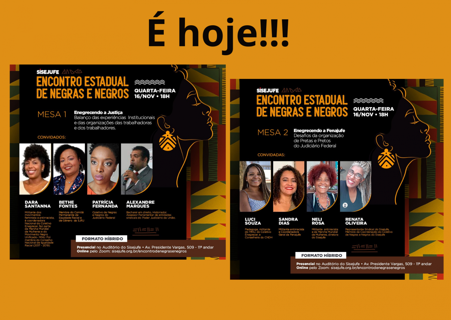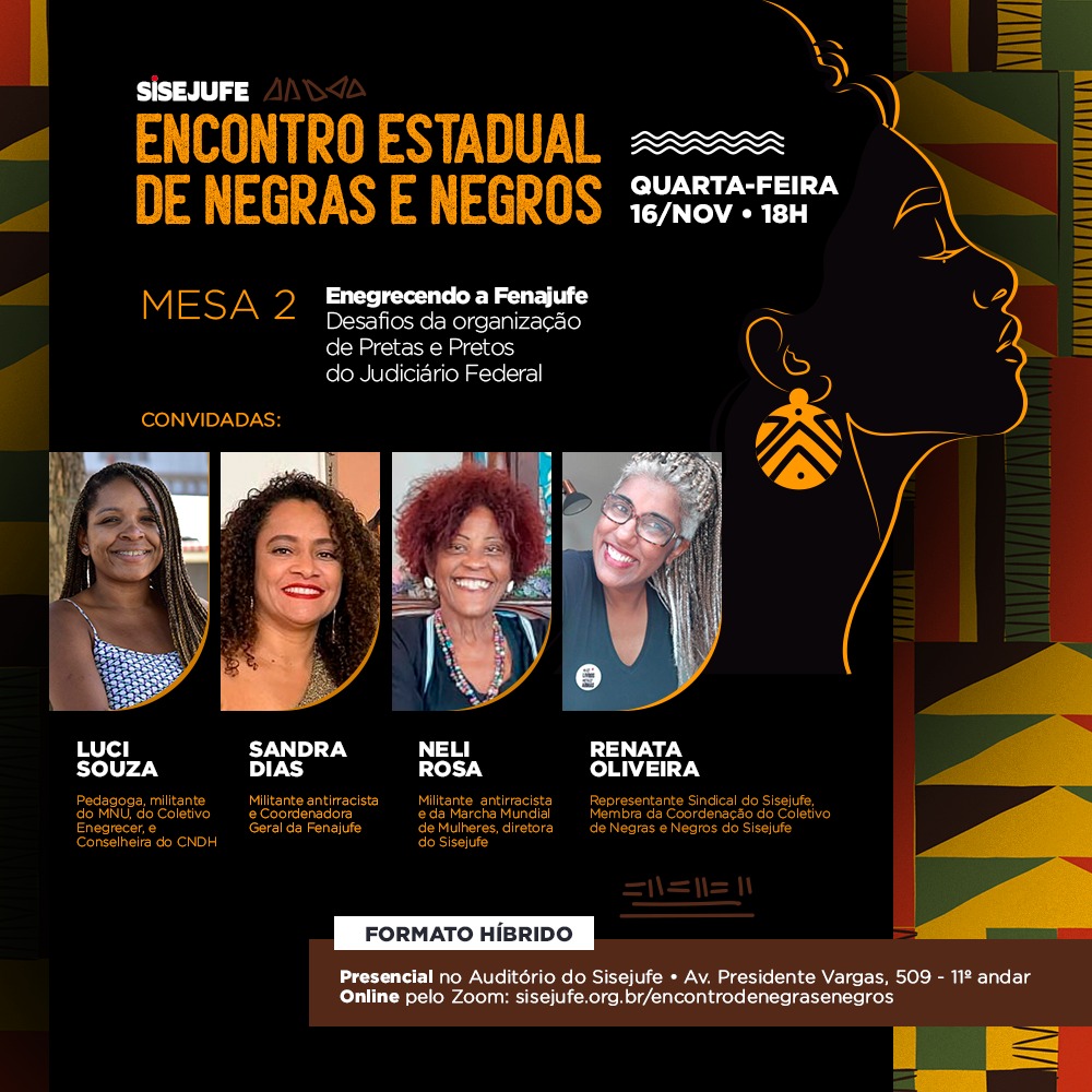 Lembrando que o evento será realizado em formato híbrido: presencial, na sede do Sisejufe, e de maneira online, pelo link do Zoom sisejufe.org.br/encontrodenegrasenegros